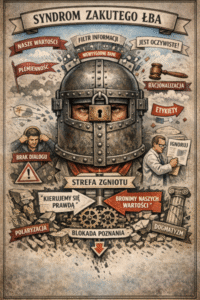 Syndrom „zakutego łba” to stan deformacji poznawczej, w którym wiedza jest całkowicie podporządkowana uprzednio przyjętym wartościom, a proces poznania przestaje być otwarty, stając się mechanizmem selekcji i obrony tych wartości. Nie chodzi tu o brak wiedzy, lecz o zamknięcie poznania.